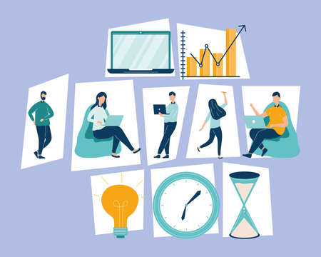 Productivity concept set. Character worktime optimization. Employee job