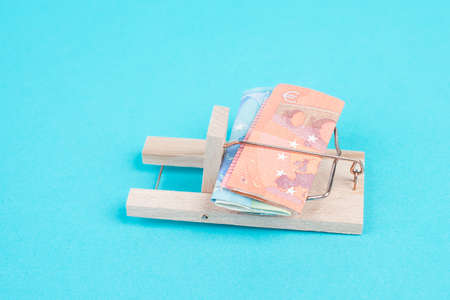 Euro banknotes in a mousetrap, bank loan, financial debt, inflation, risky credit and investment