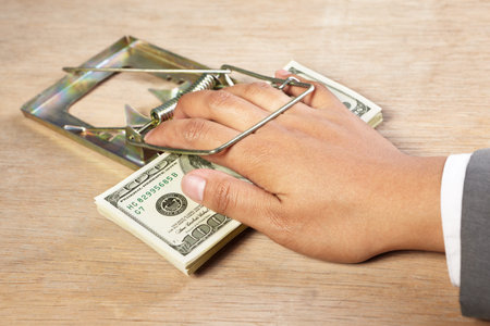 People hand is about to catch the money placed on mousetrap