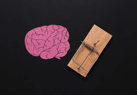 Paper cut brain with a mousetrap on black background. Fake information, brain tricks