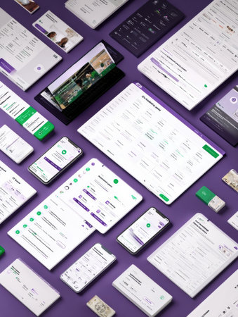 Multiple digital device screens are arranged creatively with modern user interface designs, emphasizing usability and aesthetic appeal on a purple backdrop.