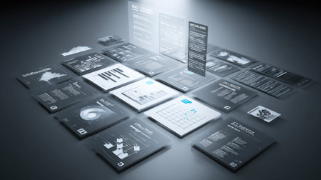 A modern display of data analytics featuring various charts, graphs, and reports on a sleek surface. Ideal for business intelligence and presentations in corporate settings.