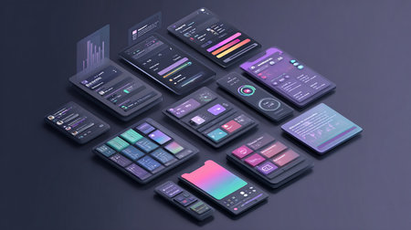 Digitally rendered screens displaying abstract data visualizations are arranged on a dark surface. The screens showcase gradients of color, including blues, greens, and purples, and feature vector graphics of waveform patterns. The lighting suggests a modern, technology-focused environment, suitable for various editorial and commercial applications.