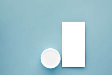 blank cosmetics jar and empty flyer on blue background. moisturizing cream jar and instruction for use. Top view