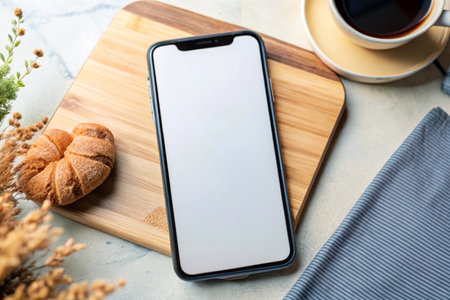 Smartphone mockup, Phone with blank screen template. Flat lay, Minimalist styled.