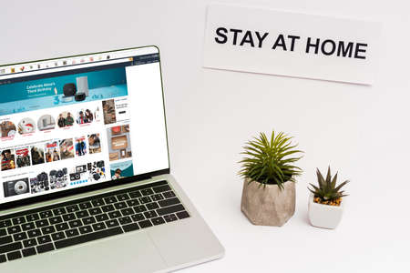 KYIV, UKRAINE - APRIL 8, 2020: laptop with amazon website on screen near plants and paper with stay at home lettering on white