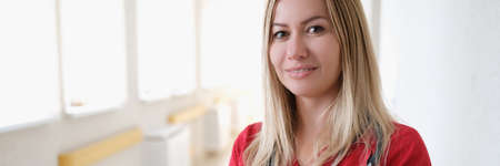 Portrait of young female doctor with stethoscope in red uniform in hospital corridor
