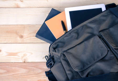 Notebook coming out of an open leather briefcase Vintage Retro Filter.