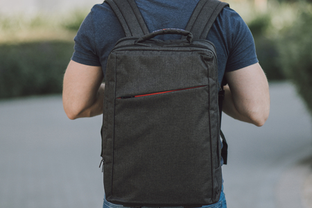 Backpack traveler closeup over green tree nature background, banner with copy space, holiday vacation travel and lifestyle concept
