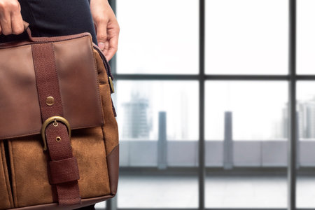A stylish brown leather briefcase made of soft leather stands on a textured wooden surface in a photo studio. Symbol of successful work in business.