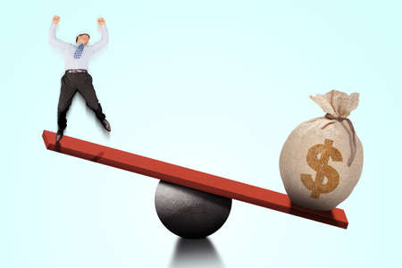 An unbalanced businessman standing on a wooden seesaw and overweighed by a wrecking ball.