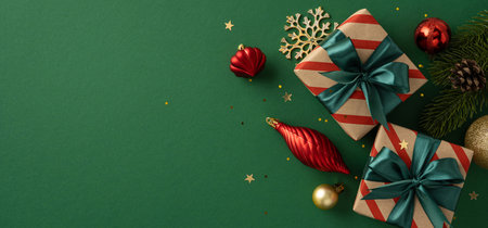 Christmas presents and decorations arranged elegantly on a green background, evoking holiday spirit