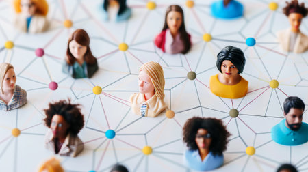 Interconnectedness of Humanity Illustrated with Diverse Miniature Figures on a Network.