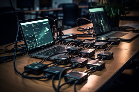This image showcases a close-up view of a USB cable securely connected to an electronic device's port, surrounded by colorful neon lighting.