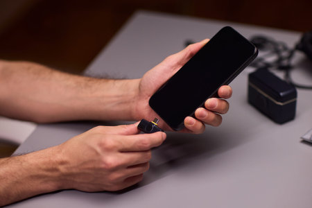 Two people using two mobile phone sharing USB Power Bank on a table to charge the mobile devices.Technology device charge sharing concept.
