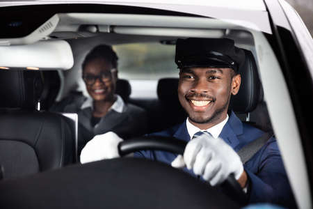 Businesswoman Sitting Behind Happy African Male Chauffeur Driving Car