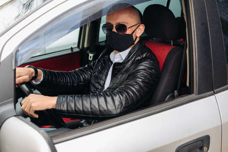 A man driving a car in a protective mask and gloves.Prevention of coronavirus infection.Protective measures against coronavirus, covid-19