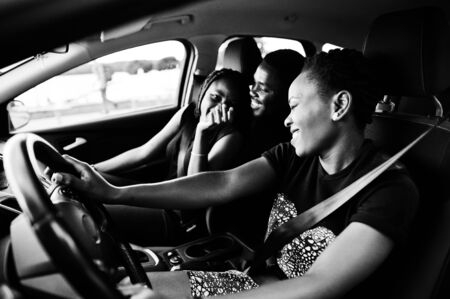Young african american friends sitting inside a car.