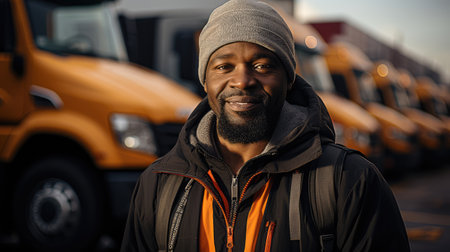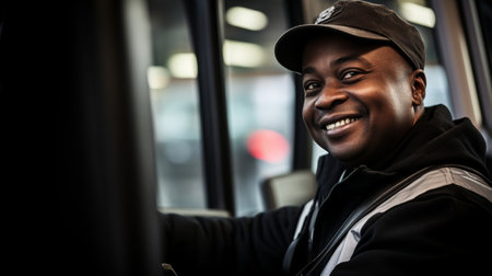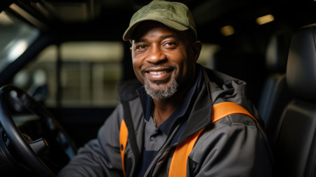 Portrait of a cheerful African American truck driver smiling warmly while seated in his vehicle, wearing a cap and work attire.