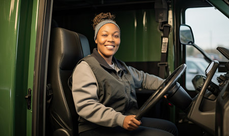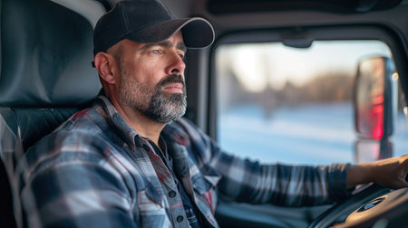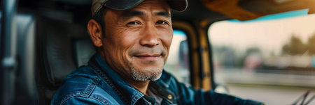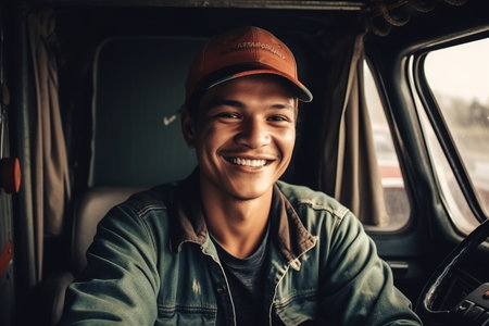A cheerful driver sits in the cab of a truck, enjoying the open road and the freedom that comes with it. AI Generative AI