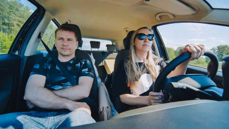 Driving school concept. A car instructor teaches a young woman how to drive. Teaching the rules of the road and driving a vehicle