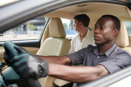 Serious taxi driver driving car with passenger from airport to hotel