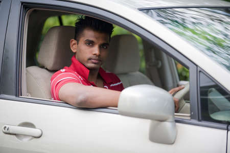 A handsome Indian man in a saloon car outside in countryside