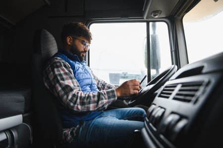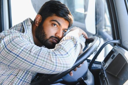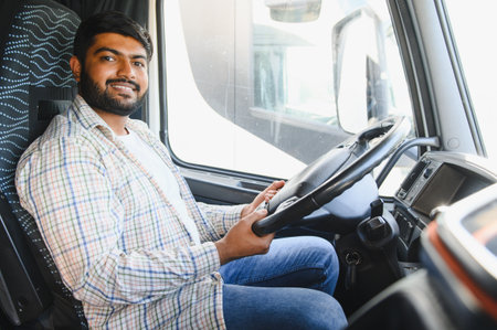 Indian driver sitting in his truck cab, holding the steering wheel and smiling, expressing job satisfaction and professionalism