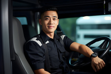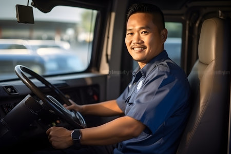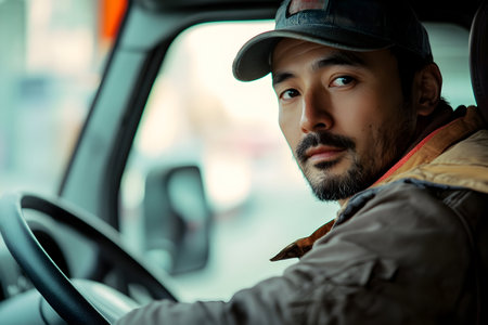 Asian man drives truck with confidence.