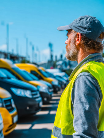 A worker in high-visibility gear pauses amid bustling city traffic, with bright yellow vehicles lined up on a lively street under overcast skies.