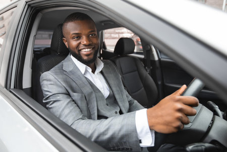 Smiling young black businessman driving luxury car