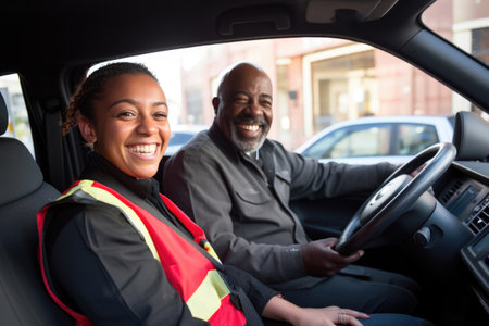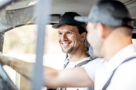 Two cheerful delivery company employees in uniform having fun while driving a cargo vehicle, delivering goods to the customers