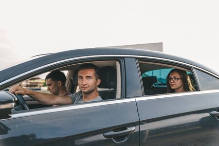 Young friends in casual clothes traveling together by the car