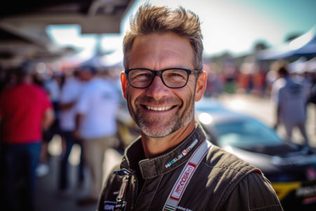 Racing driver in helmet and sportswear driving a race car. Generative AI.