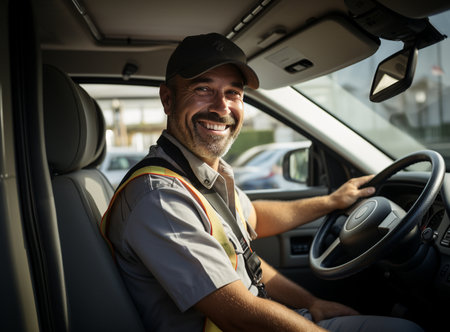 Smiling airport worker sitting behind the steering wheel