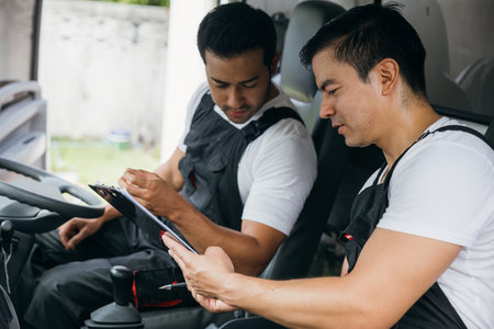 Professional truck driver operating a digital tablet for logistics management while parked in the large vehicle cabin