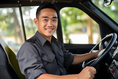 portrait of asian male driver driving a car at the airport