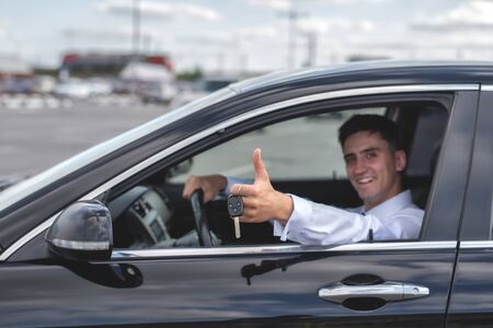 Young man sales Manager shows you the car keys on the background of the cars