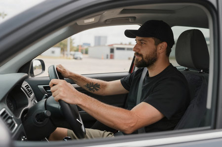 Focused driver navigates city traffic, showcasing determination and style behind the wheel.