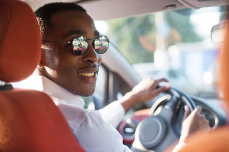 Portrait of positive Black man driving car through city