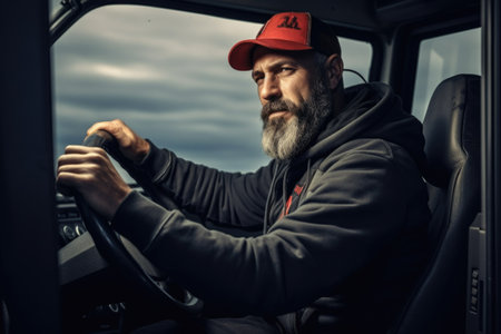 A man wearing a red hat is pictured driving a truck. This image can be used to depict transportation, driving, or a working professional.