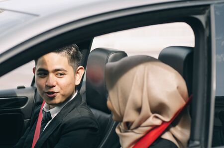 couple of young executive siiting in a car and talk each others