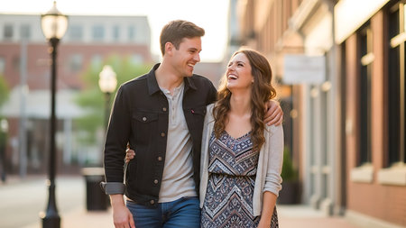 Happy young couple in love walking in the city. Romantic date.