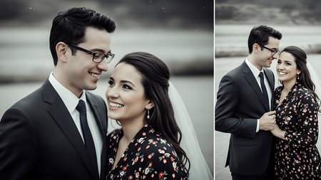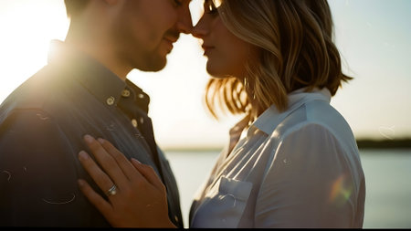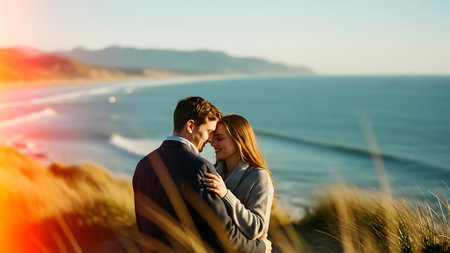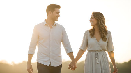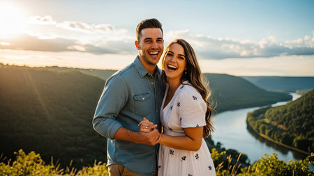 A smiling couple is depicted holding hands in an outdoor setting, likely during the day. The image features soft lighting and a warm color palette. The background showcases a river, hills, and a bright sky. It could be used in projects about relationships, happiness, or leisure, with commercial potential.
