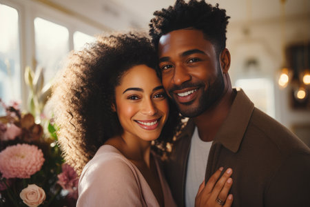 This image captures the pure delight of an African American couple, embracing warmly while holding a bunch of fresh white tulips. Their expressions convey deep affection and shared happiness.