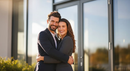 Couple enjoying a joyful moment in a modern urban setting with greenery and stylish architecture