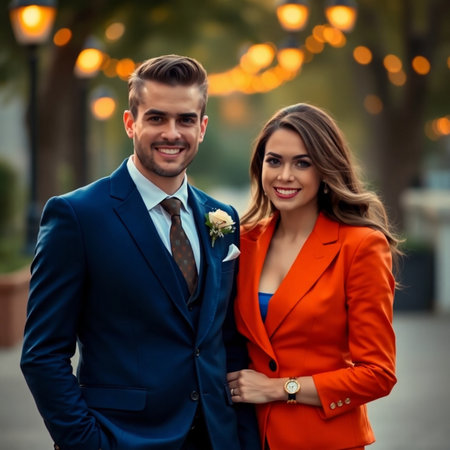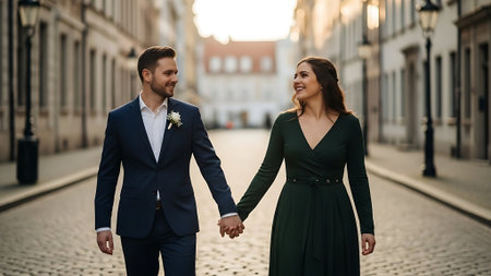 A smiling man and woman, dressed in formal attire, stroll together through a charming, sunlit city street lined with old buildings and street lamps.