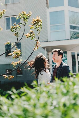 Couple Dating Enjoyment Hugging Urban City Concept. Valentine's Day celebration. Young beautiful couple in love dating outdoors and smiling.