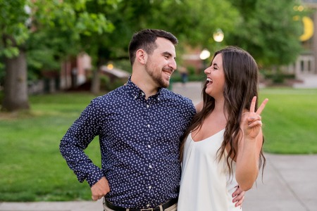 A joyful couple shares a close moment, both beaming with genuine smiles. They appear to be in an outdoor setting, possibly at dusk, with soft bokeh lights in the background.
