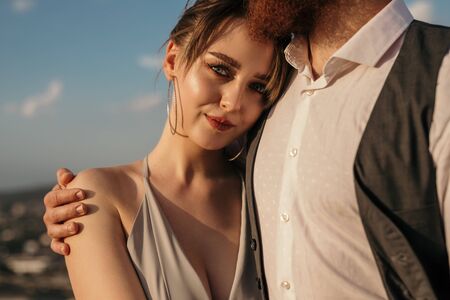 Close-up portrait of a young couple in love on the beach at sunset